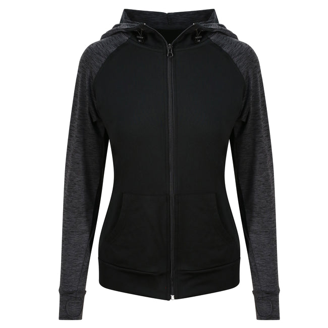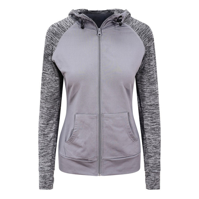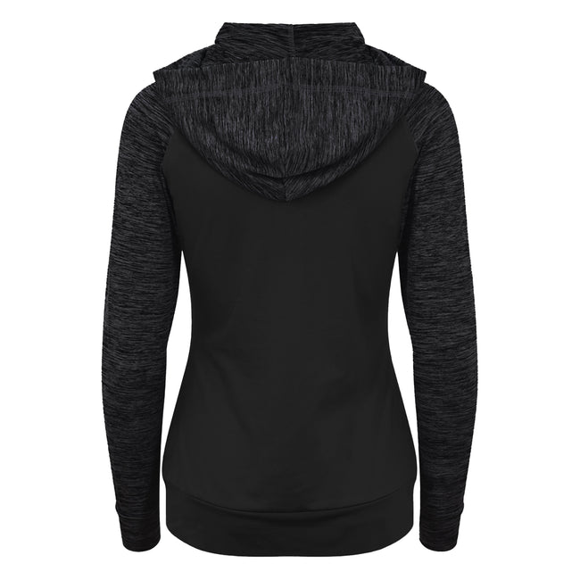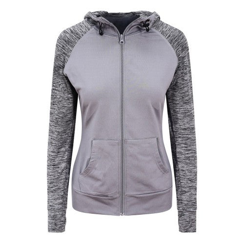 • A feminine fit sports zoodie with adjustable drawcords hood, raglan sleeves with thumb holes and full-front zip.
