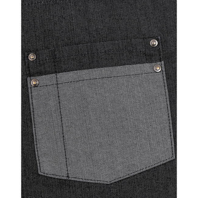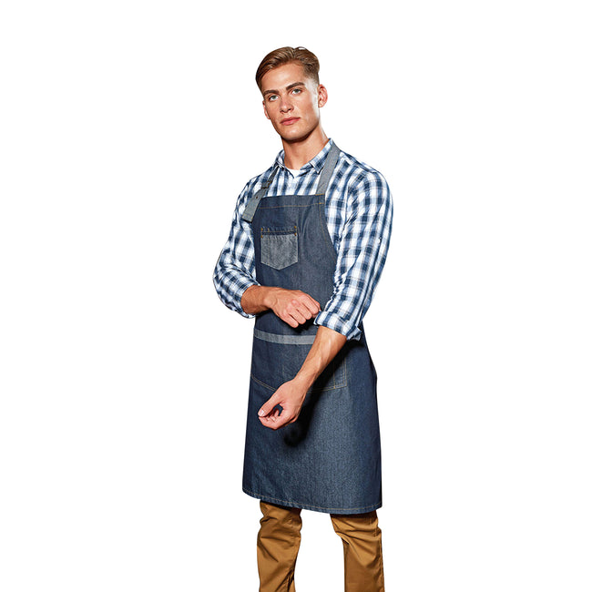 - A full bib denim apron with two large metal eyelets that secure the waist ties.