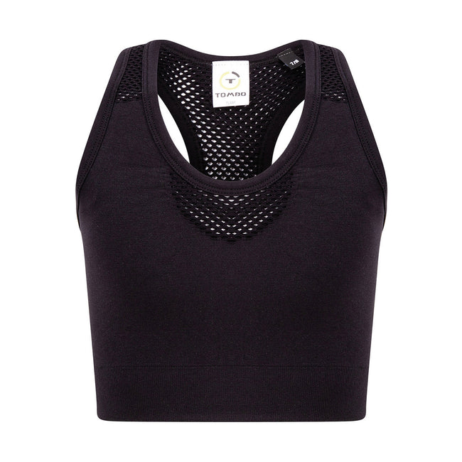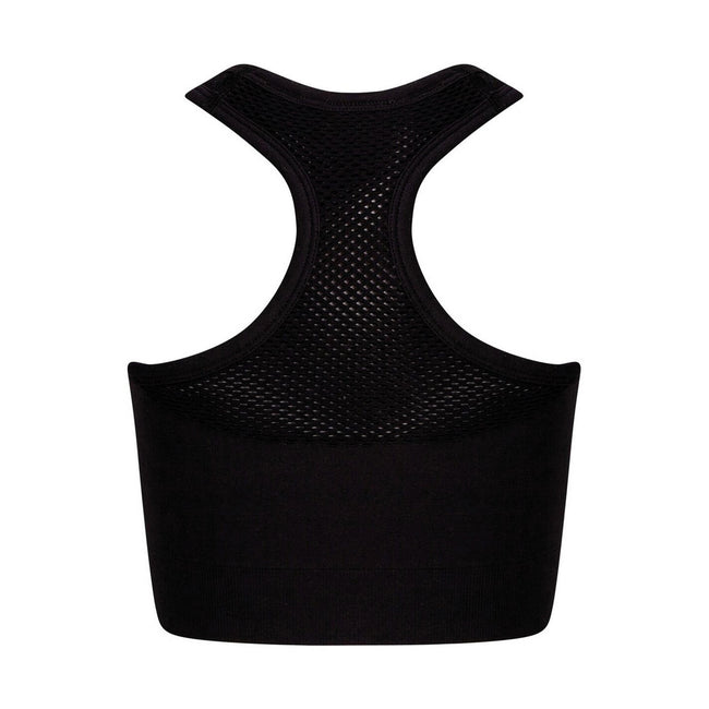 - Racerback Panel, Seamless, Self Fabric Armholes, Self-fabric Binding around Neck, Self-fabric Mesh Inserts on the Front Straps, Tearaway Label, V Insert.