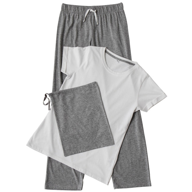 - Womens long pant pyjama set with a white t-shirt with roll up sleeve detail and a looser crew neck.
