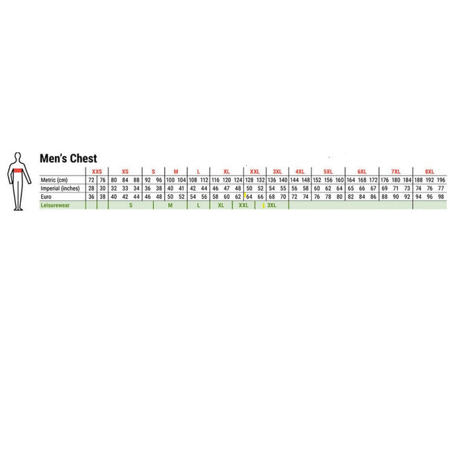 - Sizes (chest to fit): XXS (32/34in), XS (34/36in), S (36/38in), M (38/40in), L (42in), XL (44/46in), XXL (48in), 3XL (50/52in), 4XL (54in).