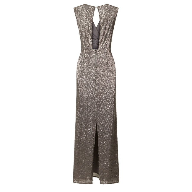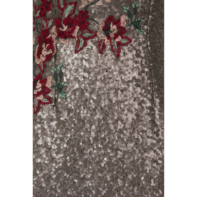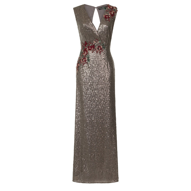 - A v-neck column maxi dress in mocha sequin with floral embroidery and keyhole button fastening.