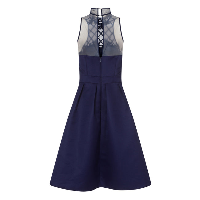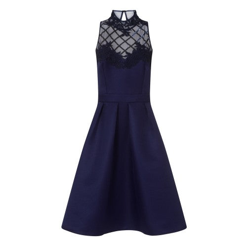 - A navy high neck prom dress with floral applique, sequin grid mesh yoke and box pleat skirt.